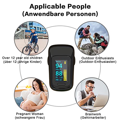Fingeroximeter für fast alle Altersgruppen geeignet, einschließlich älterer Menschen, Erwachsener und Kinder. Sie können es zu Hause und im Freien für die Gesundheit der Familie, des Sports und der Gesundheit der Gemeinschaft verwenden. Hinweis: Dieses Pulsoximeter ist nicht für Neugeborene geeignet.